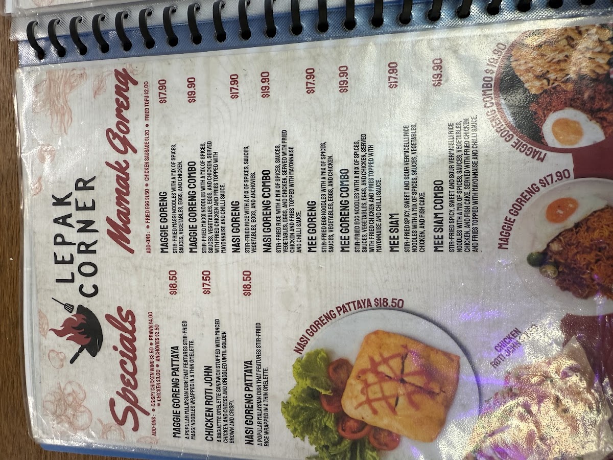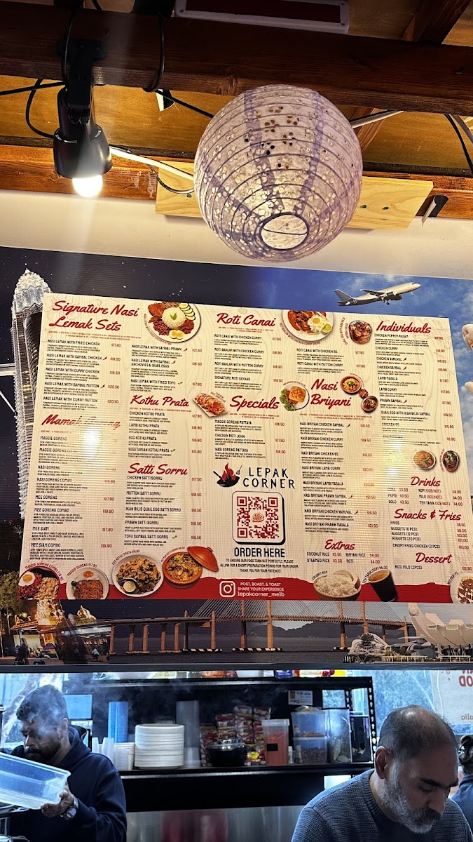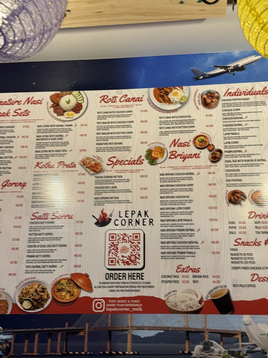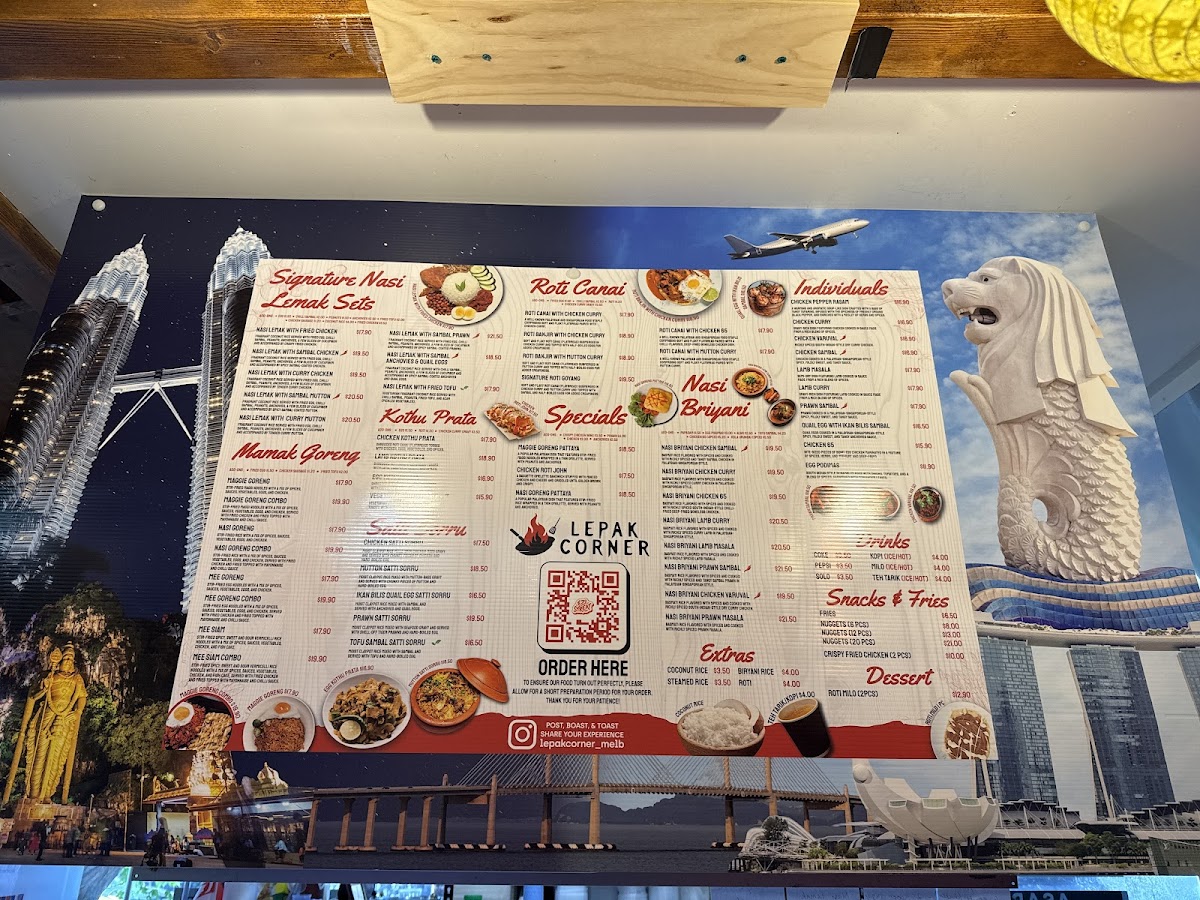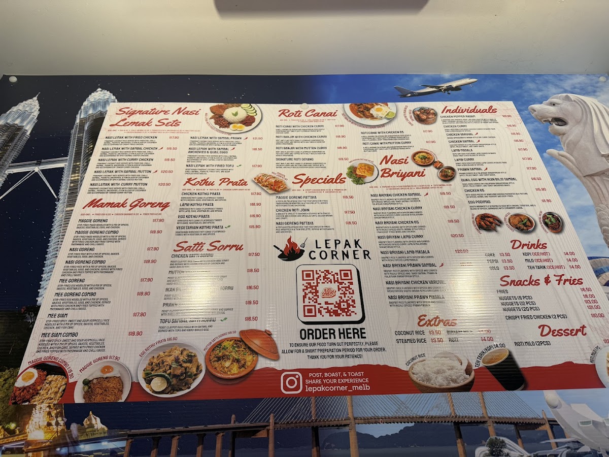 Lepak Corner offers a diverse and enticing menu that showcases classic Malaysian and Indian-inspired dishes, with something for everyone. The Signature Nasi Lemak Sets are a standout, offering a variety of options such as Nasi Lemak with Sambal Chicken, Fried Chicken, Fried Tofu (V), and more, all served with fragrant coconut rice and sambal. Prices for these sets are competitive, reflecting the generous portions and authentic flavors. For fans of fried rice and noodles, the Mamak Goreng section has favorites like Nasi Goreng, Maggie Goreng, and Mee Goreng, with options to customize combos. The Roti Canai choices, including Roti Milo, Roti Goyang, and Roti Banjir with Mutton or Chicken Curry, offer hearty, comforting meals perfect for dipping. For those seeking something a little different, the Roti John (Chicken Roti John) is a deliciously indulgent choice. The Kothu Paratha menu features a variety of protein options such as Chicken, Lamb, and Egg, with a vegetarian option as well. When hunger strikes between meals, there’s a selection of Snacks and Fries, including Crispy Fried Chicken and Nuggets, available in packs of 6, 12, or 20 pieces. Extras like Coconut Rice are also available to complement your meal. If you're in the mood for a deal, the Buy 2x Mains special offers a great value. To round out the meal, indulge in a Cadbury Dairy Milk Ice Cream or sip on a Soft Drink or Bottled Water. Overall, Lepak Corner delivers an affordable yet flavorful dining experience, perfect for both casual meals and satisfying cravings.